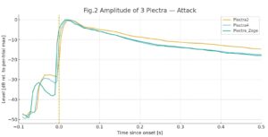 The measurements were taken of the sound produced by koto tsume blended with cellulose nanofibers made from bamboo. Below is a graph showing the measured acoustics of product numbers 2 (orange line) and 4 (sky blue line), and the one made of ivory (blue line), all with different material compositions.