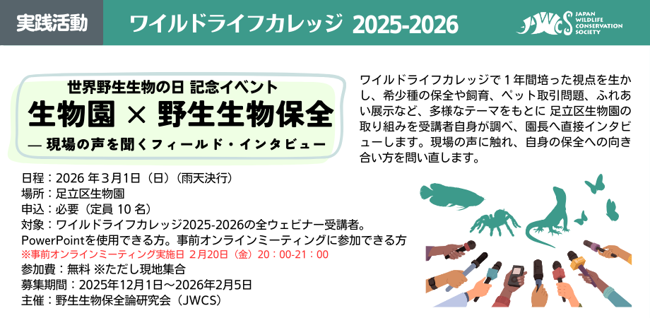 ワイルドライフカレッジ2025-2026の全ウェビナー(夏講座・冬講座含む)すべてを受講された方を対象に、足立区生物園で行う野生生物の日イベントの参加者を募集します。